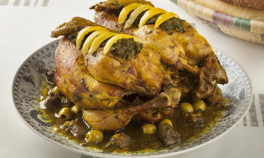 الدجاج المحمر هو أيقونة المطبخ المغربي الاحتفالي. دجاج طري بلون ذهبي لامع، يُطهى ببطء في تتبيلته العطرية ويُقدّم مع صلصة "الدغميرة" الغنية بالبصل والزيتون. إنه الطبق الذي يجسد الكرم والضيافة المغربية في أبهى صورها.